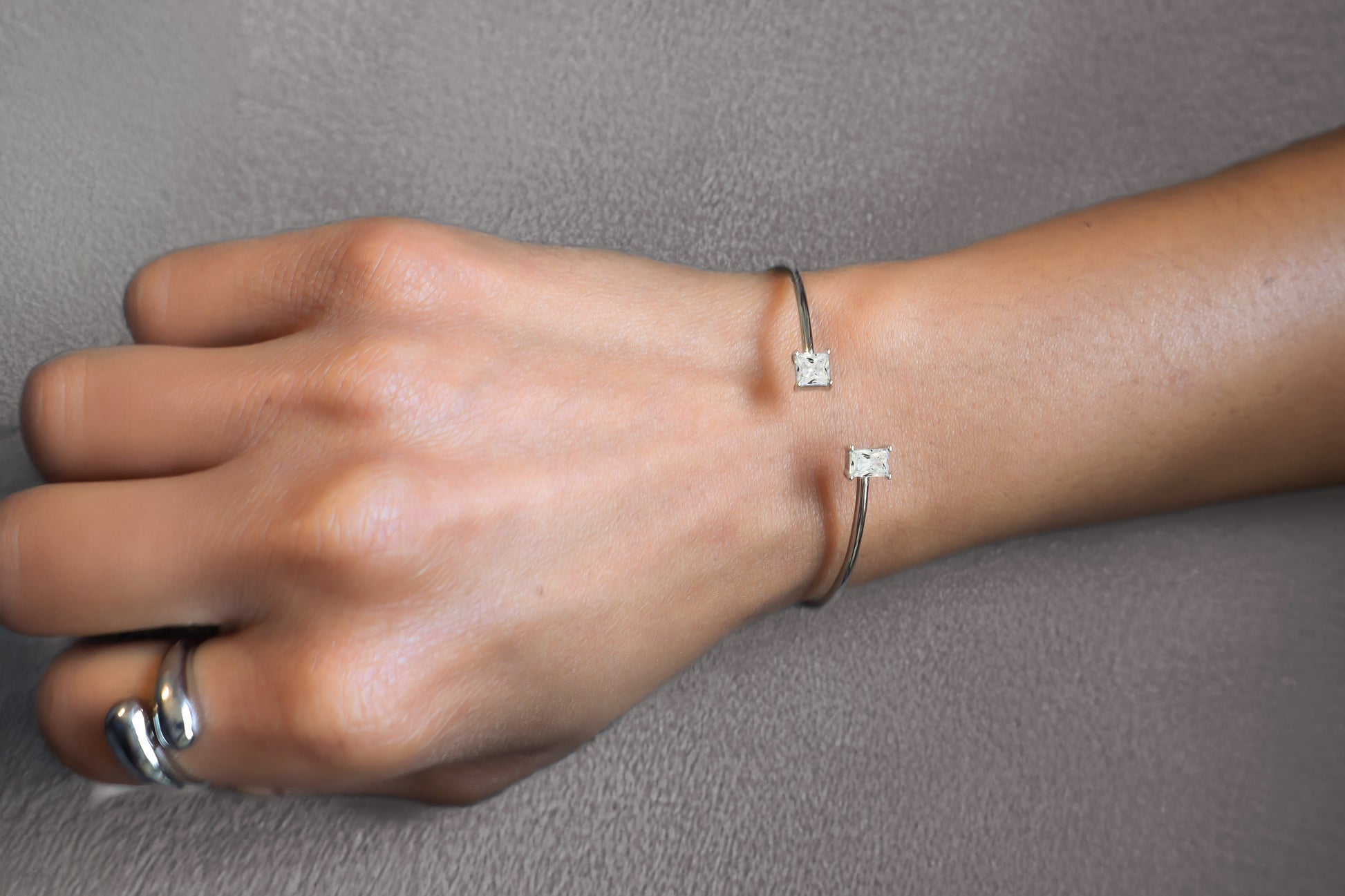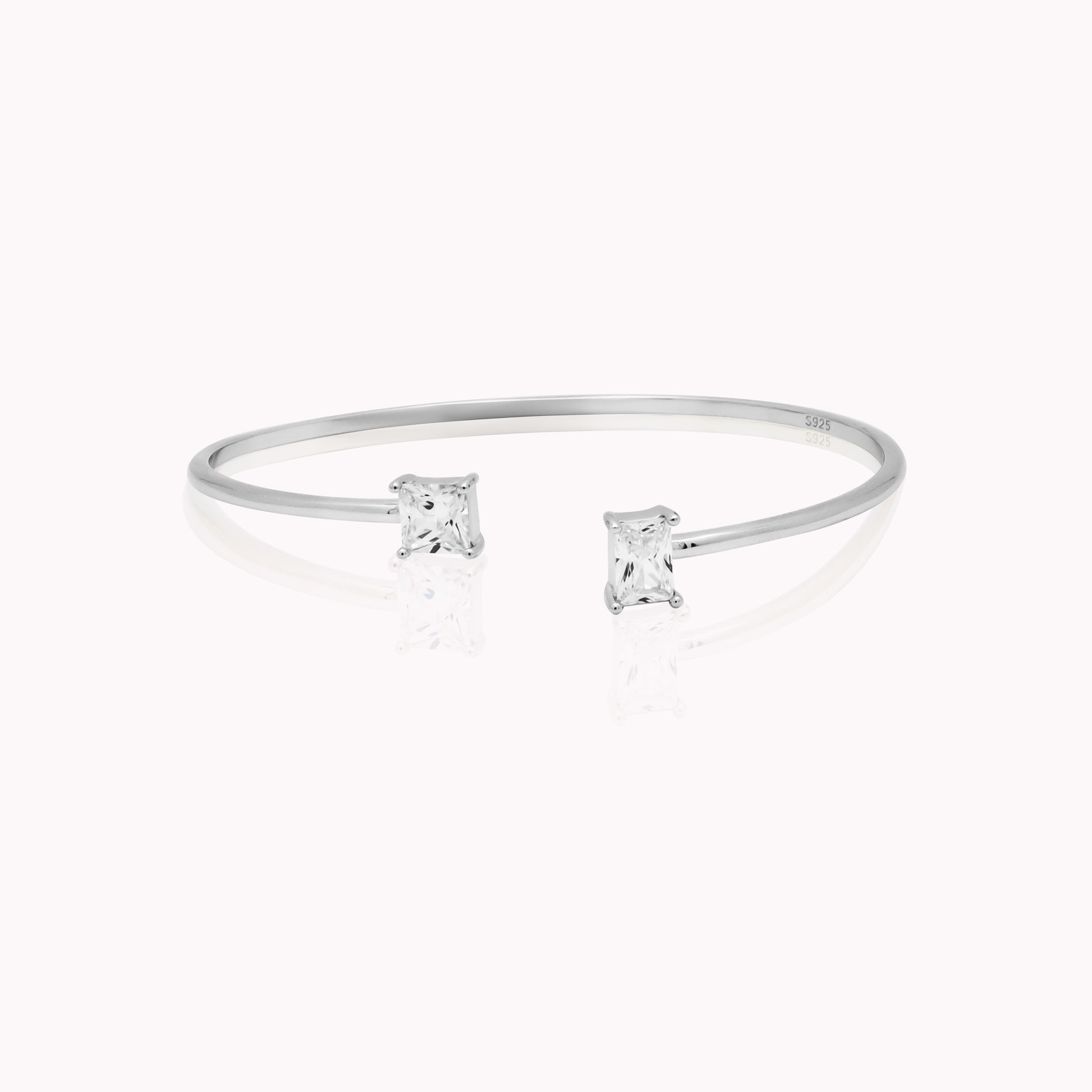 This sleek silver cuff bracelet is the epitome of style and elegance. The classic design features sparkling cubic zirconia crystals at the ends, adding just the right touch of glamour. Elevate any outfit with this timeless accessory.